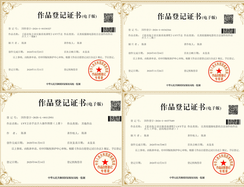 陈准不仅是LYT手法介入治疗研发、创始人,还是《蓝语兔言语实操系统课程》研发者、作者。她明白,要让LYT技术更好地服务孩子,完善的课程体系至关重要。在研发过程中,陈准反复推敲,结合大量临床案例,将LYT言语手法介入的理念与操作,融入课程的每一个环节。从理论讲解到实操指导,陈准力求精准、细致,让每一位学习课程的人,都能掌握LYT技术的精髓。她希望通过课程,让更多人了解LYT,让这一技术能帮助到更多孩子。